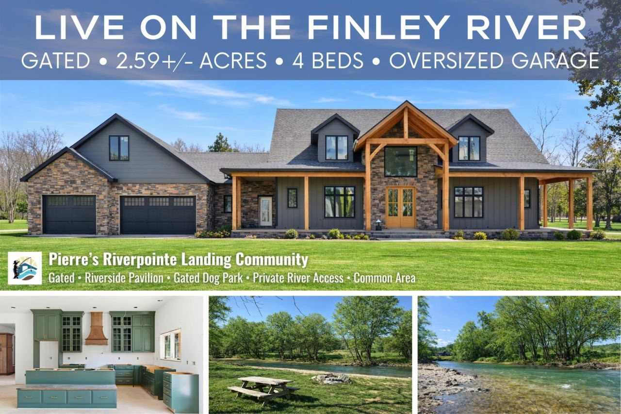 Welcome to 125 Riverpointe View in Ozark, Missouri, a stunning new construction home set on 2.59 acres in the scenic community of Pierre's Riverpointe Landing overlooking the Finley River. Designed for those seeking modern luxury in a peaceful natural setting, this 1.5 story home offers approximately 3,579 square feet with 4 bedrooms and 3.5 bathrooms. As you walk in, you are greeted with a soaring entry and an open floor plan, ideal for everyday living and entertaining. The living area and kitchen features surround sound, a large island with seating, custom hood and cabinetry, walk-in pantry, nearby laundry room, and has access to the covered porch. Just off the kitchen is a mud hall with powder bath, custom built-in storage, entry to the garage and the covered porch. The primary bedroom is located on the main level and features two large walk-in closets and a private en-suite with dual sink vanity, soaking tub, walk-in shower, and private access to the covered porch. The main level also includes a second bedroom with its own private en-suite. Upstairs offers two additional bedrooms and a full bathroom, providing flexible space for guests, family, gym, or home office use. The garage features 9 feet of extra deep space for storage and modern living needs. Pierre's Riverpointe Landing is designed for those who want to reconnect with nature while enjoying modern amenities. This soon-to-be gated community offers breathtaking Finley River views, spacious estate lots, private river access for fishing and water activities, scenic walking paths, fire pits, a riverfront covered pavilion with kitchen and seating, and a fenced dog park. Located just minutes from shopping, dining, and everyday conveniences in nearby Nixa while still offering the privacy and tranquility of a secluded riverside setting, this property offers a rare opportunity to enjoy new construction in one of the area's most unique natural communities.