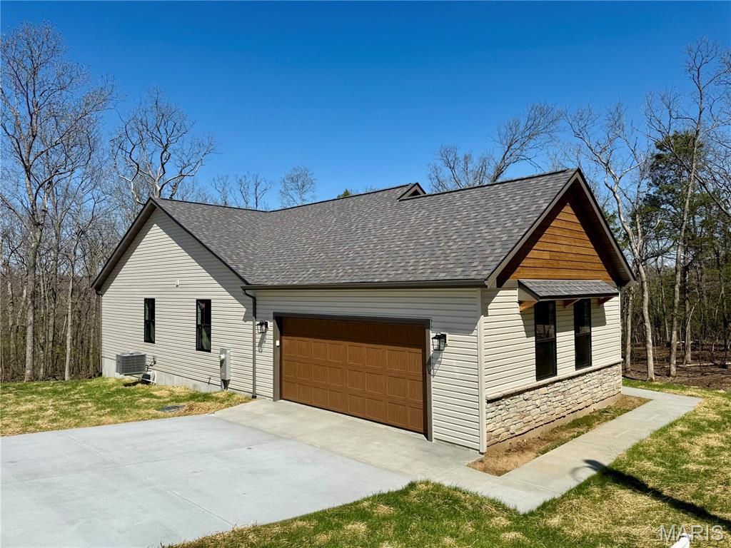 ~ BRAND NEW home in Terre du Lac offers 3 bedrooms, 2 full bathrooms, 2 car side-entry garage & covered front porch. Exterior stone accents are also found inside! Floor to ceiling stone surrounds the electric fireplace complete with hearth and mantle. Vaulted ceilings and open floor plan with 100% waterproof hybrid resilient plank flooring throughout. 5 solid wood base trim. Dark bronze tilt-in windows. Kitchen features soft close oak cabinets with hardware & quartz countertops, a center island, crown molding, all four GE stainless appliances, backsplash, garbage disposal & walk-in pantry with custom shelving & cabinets with countertop. Primary bedroom features a walk-in closet & full bath with Onyx step-in shower and glass shower door enclosure. The spacious main floor laundry just off the attached garage is complete with mud sink & shelving. Deck overlooks wooded view. Walkout basement is a blank canvas with rough-in plumbing for future bath, egress windows & upgrade feature of an 8'x19' concrete vault room with electric and door. Spectrum available. Builder provides a one-year warranty. All measurements are approximate. Private lake community 1 hour south of STL. 16 lakes, fish, boat, swim.