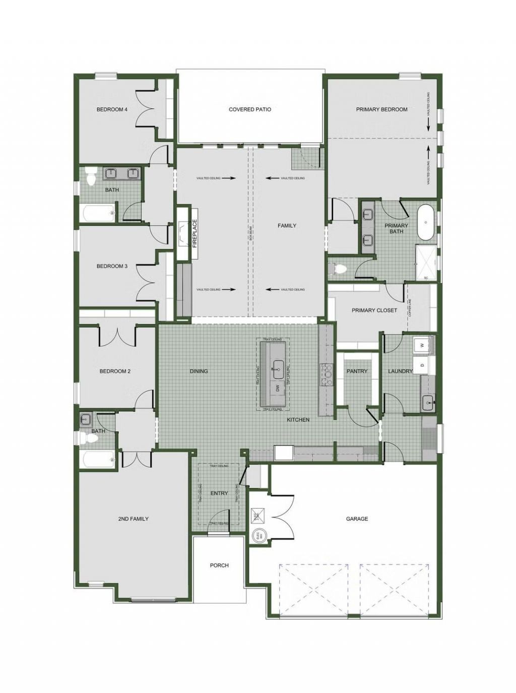 The 2800 floor plan offers approximately 2,800 square feet with 4-5 bedrooms, 3 bathrooms, and a bright, open single-story design. Wood-plank tray ceilings in the foyer and above the kitchen island add warmth from the moment you enter. The main living area features a vaulted ceiling with a stained box beam, a large window wall, and an optional fireplace with built-ins, plus a vaulted back porch for effortless indoor-outdoor living.The kitchen includes a spacious island and an oversized walk-in pantry, while the dining room is highlighted by a stylish accent wall and a layout that flows naturally into the family room.A second living space at the front of the home offers flexibility for aging parents, returning adult children, or a dedicated office. Buyers may also choose a second primary suite or a fifth bedroom.The primary suite features a vaulted ceiling, a freestanding tub, a glass-framed shower, and a generous walk-in closet. Secondary bedrooms are well-positioned for privacy, and the laundry room includes a built-in sink.With its vaulted living room, spacious kitchen and dining layout, and adaptable options, the 2800 floor plan blends comfort, character, and everyday convenience.