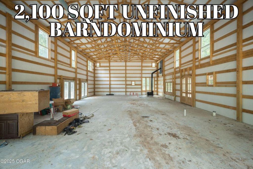 Discover 38.33 acres in Eagle Acres Phase II, Goodman, MO. This property includes an unfinished barndominium (approx. 2,100 sqft), fully enclosed with the exterior complete and framed for three garage bay doors. The land has subdivision road access and also backs up to the highway (no direct drive access). Trails are cut throughout the property for easy viewing and exploration. Electricity is already on site.