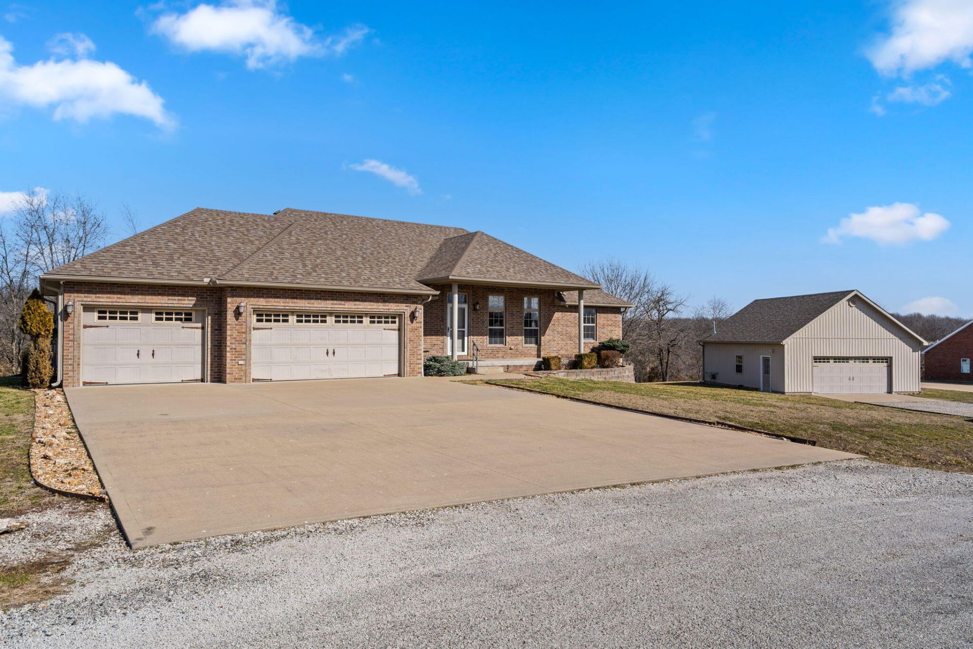 Welcome to this move-in ready walk-out ranch in the highly sought-after Cedar Gate Estates. Situated on 1.27 acres, this spacious 5-bedroom, 3-bath home offers approximately 3,771 sq ft of heated and cooled living space--designed for comfort, functionality, and effortless living.A 3-car attached garage is complemented by a bonus John Deere room, dedicated storage area, and an impressive 27' x 32' heated and insulated shop--ideal for hobbies, lake toys, or additional vehicles.Start your mornings on the covered back deck, taking in peaceful views of the expansive backyard. Inside, the bright and airy main level showcases an open-concept layout with light, neutral finishes throughout. The well-appointed kitchen features custom wood cabinetry, stainless steel appliances, a gas range with double oven, and a generous dining area perfect for everyday living or entertaining.The owner's suite is a true retreat, complete with tray ceilings, serene wooded views, dual vanities, a walk-in shower, and a jetted tub. Two additional bedrooms, a full bath, and a conveniently located laundry room complete the main level.The fully finished walk-out lower level expands your living space with a large second family room featuring a cozy gas fireplace and direct patio access. Two additional bedrooms, a full bath, and abundant storage provide flexibility for guests, hobbies, or multi-generational living.Additional updates include a new roof (2021) and energy-efficient geothermal HVAC, offering both peace of mind and long-term savings.Ideally located less than 10 minutes from Truman Lake access at Shawnee Bend, Shawnee Bend Golf Course, mountain biking trails, shopping, dining, and medical facilities. Plus, you're just minutes from the Lake of the Ozarks--home to waterfront restaurants, boutique shopping, and endless lake-day fun.A fresh season--and a new beginning--awaits at 19419 Stone Meadow Trail.