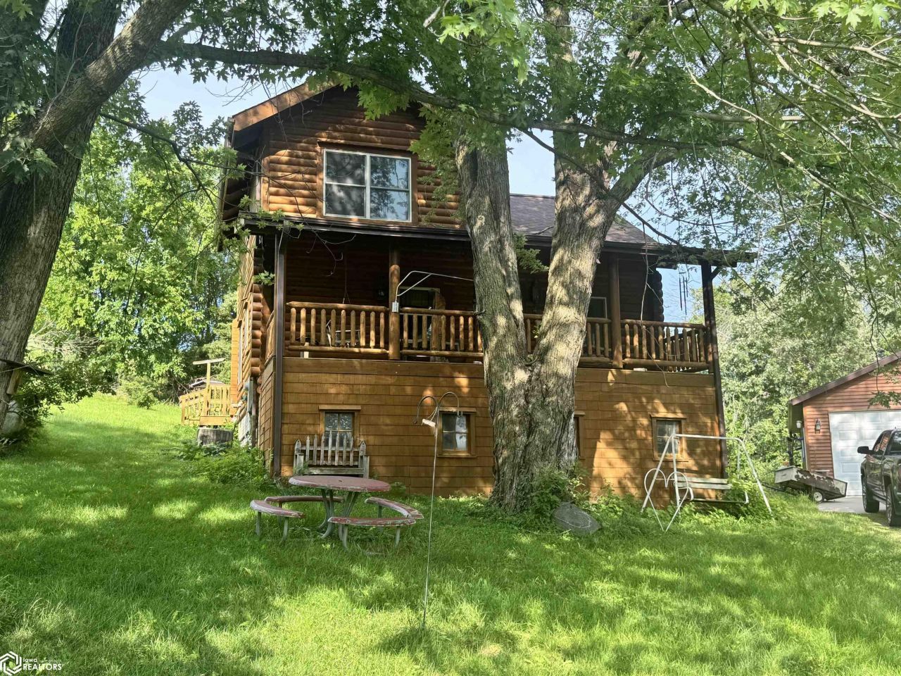 PRICE IMPROVEMENT!!! Log Cabin living at Lake Ponderosa. This home is situated on almost a full acre of ground that offers a secluded feel with 20 feet of lake access and two boat hoists just across the road. This log home is beautifully crafted with exposed beams in the main living area and an open kitchen and dining area. The heated, detached garage is large enough for two vehicles and to store a boat, with additional storage space.