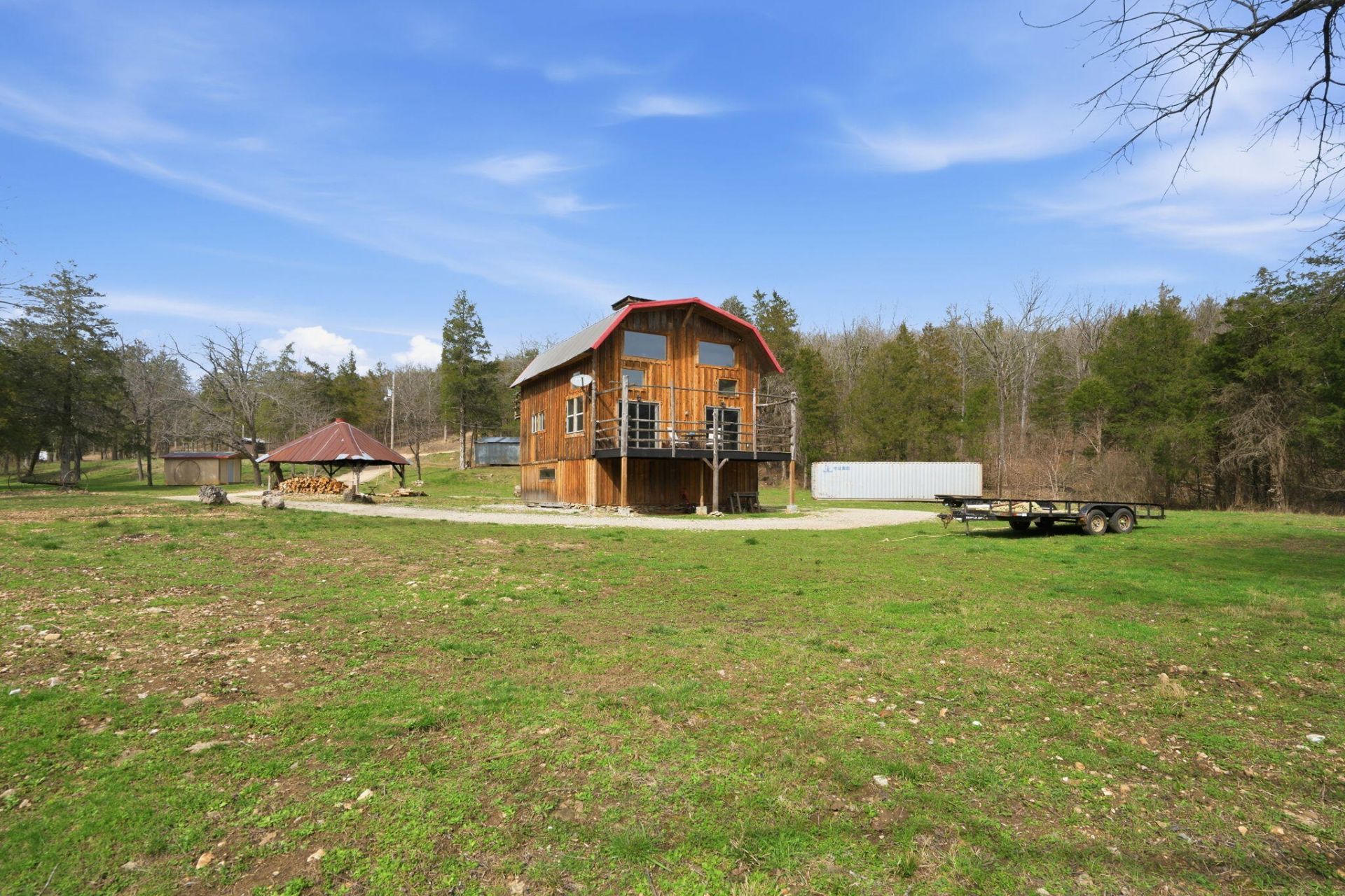 Tucked away on 40 beautiful acres in Walnut Shade, this charming log cabin offers an incredible opportunity for those seeking privacy, natural beauty, and room to grow. Just minutes from Branson and with convenient access to Hwy 65, this unique property highlights seclusion with accessibility while offering exciting potential for expansion or development. Emory Creek winds through the land, creating a peaceful, park-like setting complete with seasonal waterfalls and abundant wildlife, making it ideal for recreation, hunting, or future vision. The property is already equipped with valuable infrastructure including multiple electric meters, well water, septic systems, and an RV hookup, providing a strong foundation for additional homes, cabins, or investment opportunities. The home welcomes you with a bright, open floor plan and a warm, inviting living room featuring an electric fireplace topped with a striking tree that reaches the vaulted ceiling, creating a one of a kind treehouse feel. Natural light pours in through a wall of windows and double sliding doors, showcasing the surrounding landscape. The kitchen features stainless steel appliances, an attached dining area, and a charming wagon wheel light fixture, along with a nearby powder room and convenient laundry closet. Upstairs, the spacious primary bedroom offers beautiful wooden floors and an en-suite bathroom with a large walk in tiled shower. Step outside to enjoy a covered firepit area perfect for gathering, along with a covered parking space for a vehicle or tractor, multiple storage sheds, and even a deer stand already in place. Whether you envision a private retreat, a multi-home homestead, or a future income producing property, this acreage is ready to bring your vision to life.