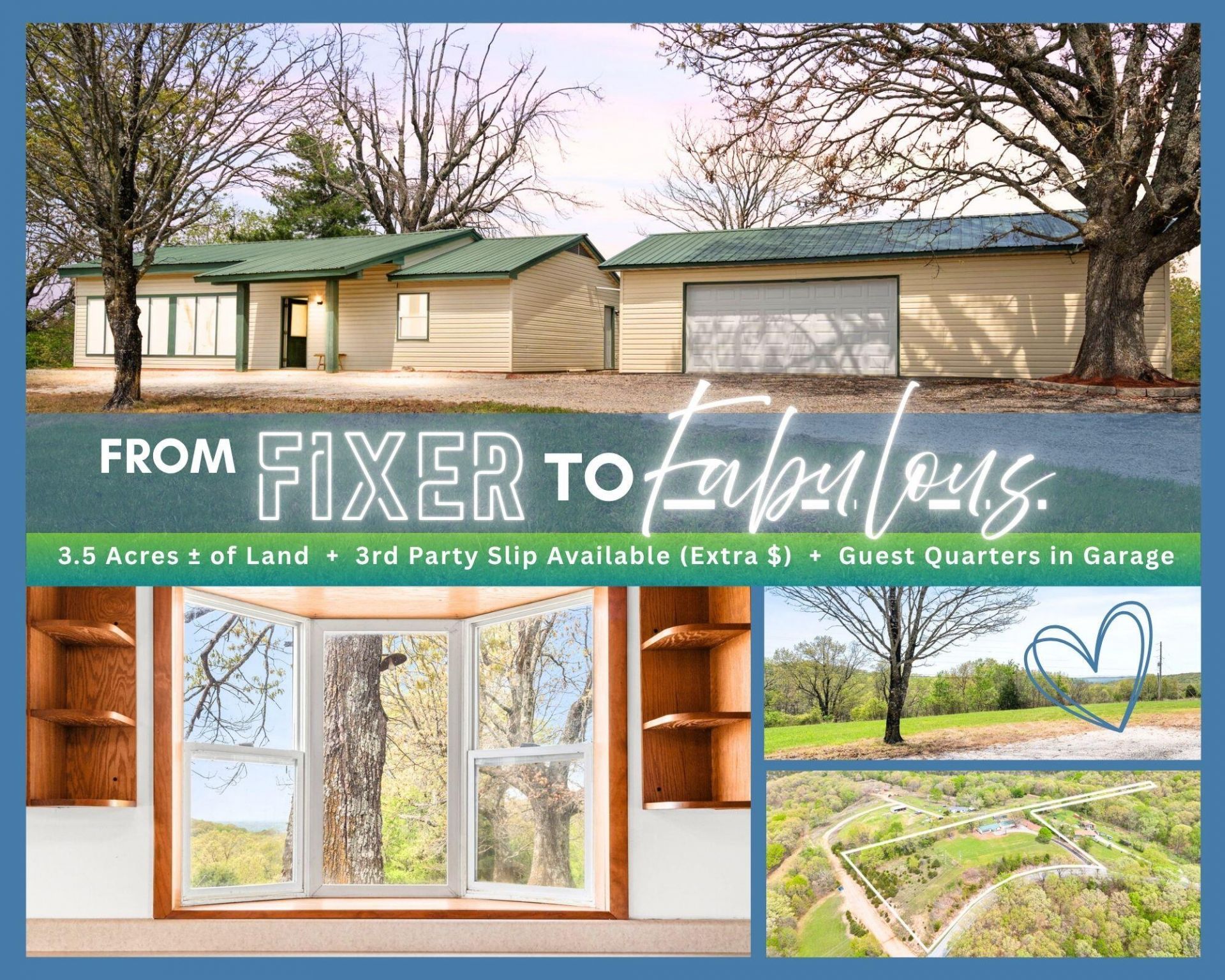 Welcome to your springtime retreat at #tablerocklake, where fresh blooms, gentle breezes, and sparkling water views set the tone for relaxed lake living. Nestled on 3.5 acres, this property offers the perfect blend of convenience and peaceful seclusion...just minutes from shopping, dining, and medical services, yet it feels like your own private countryside escape.Have your own episode of Fixer to Fabulous on this delightful home...seller has simply run out of steam, creating the perfect opportunity for you to step in and customize the finishing touches exactly how you want.The home features low-maintenance siding and a durable metal roof, offering a solid exterior foundation for easy living year-round. Inside, you'll find a spacious 2-bedroom, 2-bath layout with warm wood accents that create a cozy, inviting atmosphere. Large windows frame sweeping mountain views with peeks of the lake, bringing the beauty of the outdoors in.A 2-car garage provides ample storage, while the attached studio living quarters with a half bath offer flexible space for guests, hobbies, or your own private 'timeout terrace.'Springtime at Table Rock Lake is something special...dogwoods in bloom, mornings on the porch with coffee, and afternoons spent enjoying the water. Located just a short drive from Port of Kimberling Marina, you'll have easy access to boating, fishing, and all the lake life has to offer.For boating enthusiasts, a 3rd party 10x24 or 10x28 boat slip is available nearby for an additional fee (while supplies last just down OO hwy @ OO-9 & OO-10), or the incredible Ance Creek Recreation area with campground & massive boat launch, making it even easier to get out and enjoy the water.Whether you're looking for a full-time residence, weekend getaway, or investment opportunity, this property captures the charm and potential of lake living in every season.Home is ready for your vision and will need flooring and HVAC, making it an ideal project for the s