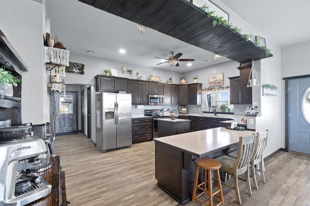 Maintenance free Metal and stone Home, Absolutely fantastic three bedroom three bath home. 2700 ft.². On almost 2 1/2 acres. Great Homestead property. Owner has gone in and done so many improvements and updates Home looks and feels more or less like a new build. Shows fantastic and a super clean and nice 10 ft. ceilings give so much charm and character. Open floor plan with a large living room and dining area. Kitchen has lots of cabinets lots of counter space Amazing wood stove. Fantastic master bedroom. With a walk-in closet. Nice big bathroom and you will have to check out the walk-in shower. It is marvelous. Nice office could also be used for a den. A bedroom. Right now it is a sewing room. Also a bonus room with a 8 x 8 concrete storm shelter for added security. Double pantries off the kitchen are fantastic lots of storage. Spray foam insulation makes the home energy efficient. Also tons of storage in the fully floored and insulated attic. Large laundry & Sun room. 2 car H & A Garage. There is a 38 x 42 shop with lean toos for all of your extras. Cars/tractors/boats/side-by-side.16 x 32 of that is insulated with a wood floor and Electric. You will love the 8 x 8 Greenhouse. And the 10 x 12 garden shed which also includes the pressure tank and control box for the well. The well is located directly behind. 12 x 12 pergola and fire pit are great for entertaining. Have all the family over for barbecues and games. Plenty of room for volleyball and horseshoes and cornhole. Large garden area it helps with this Homestead property to grow your own produce. Has grown lots of different types of produce. The main porch pillars are solid concrete. And give great curb appeal. The garage is 19 x 28 and his climate controlled as well. You can tell the love, pride and craftsmanship that has been put into this Home. Nice storage area for firewood. A lot of of it is already cut and ready for next year. It will stay. Bring your family. Bring your animals. No restriction