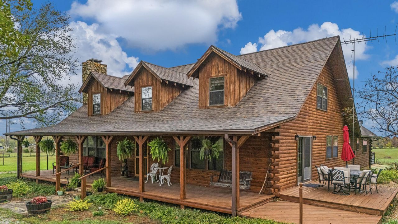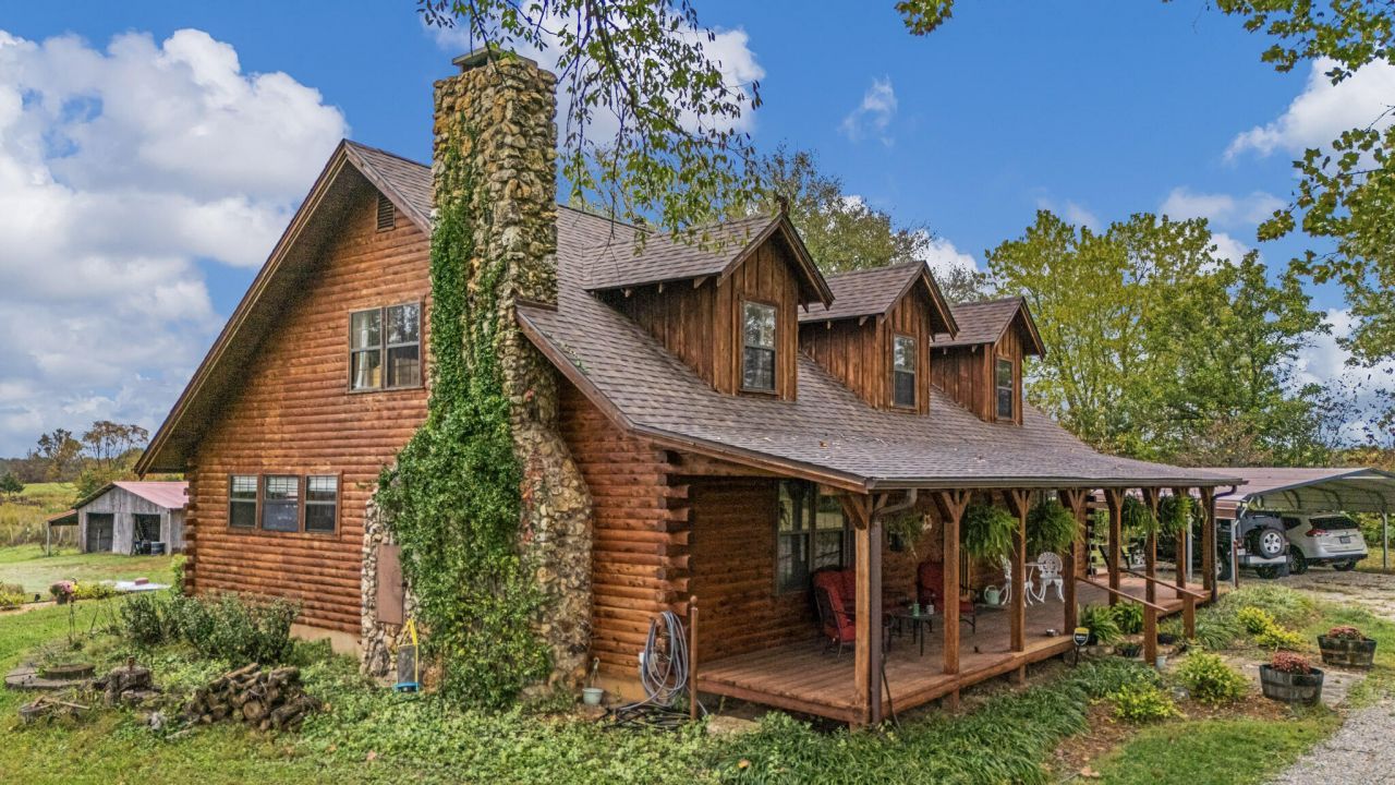 Welcome to this beautifully updated log cabin situated on 20 picturesque acres in the heart of Peace Valley. Offering the perfect blend of rustic charm and modern upgrades, this 5 bedroom, 3 bath home has been meticulously maintained and thoughtfully improved. The true pride of home ownership shines throughout. Inside, you'll find hardwood flooring throughout and a fully updated kitchen designed to impress. Features include granite countertops, a new kitchen island with electric oven, propane stand alone oven, double refrigerator with shelving, abundant cabinetry, and an updated sink with a new garbage disposal. All ideal for both everyday living and entertaining. The home also features a full unfinished basement, adding valuable living and storage space, along with a John Deere garage that's perfect for lawn equipment, ATVs, tools, or workshop use. Major improvements provide peace of mind, including a new Class 3 shingle roof and gutter system (2025), new furnace, heat pump, and hot water heater, professionally cleaned ductwork and chimney, and a recently serviced septic system with pipe repairs, new risers, and cleanout installed. Outside, the property is equally impressive. Enjoy a garden area, an outbuilding for equipment or projects, and a barn with a large lean-to offering ample coverage for equipment, hobbies, or storage. Property is fully fenced and cross fenced with a pond and open pasture. There is also a chicken coop and pig pen making this property ready for livestock and ideal for a hobby farm or rural lifestyle. Located in the Junction Hill School District, this exceptional property offers space, functionality, and comfort. A turnkey rural retreat that truly surpasses expectations.