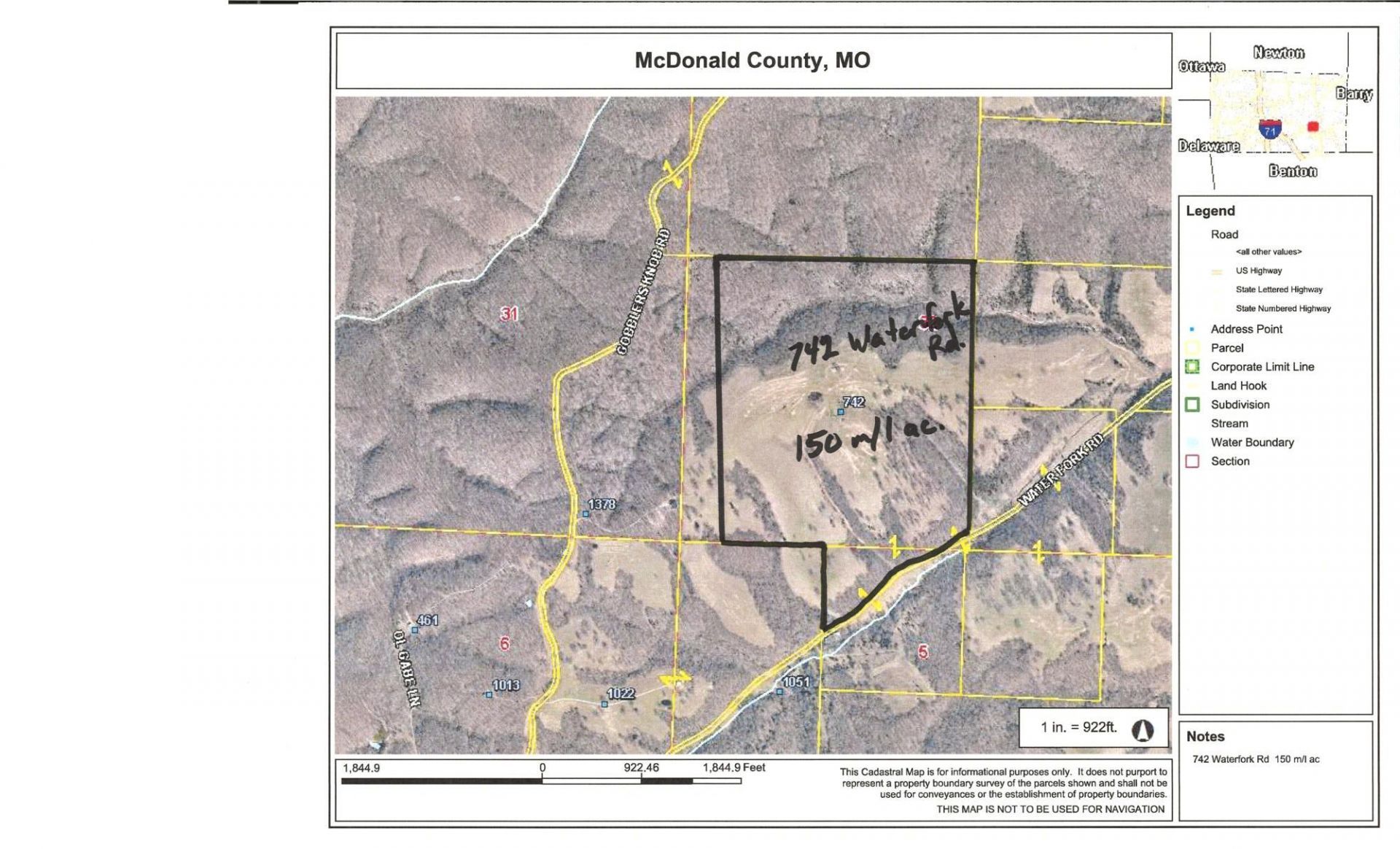 Hunters and Investors, Check this out! 150 m/l ac. in Eastern McDonald County. Located on a county maintained road with easy access from NWA Arkansas Via E Hwy. Property is 60-70% cleared with awesome views(currently running cattle) balance heavily wooded with great hunting opportunities. Improvements include a well, pipe corral system, and a couple ponds for livestock. Electric already on the property with fiber optic being installed along the road. Great investment/hunting property or pick out a spot for that 'Dream Home'