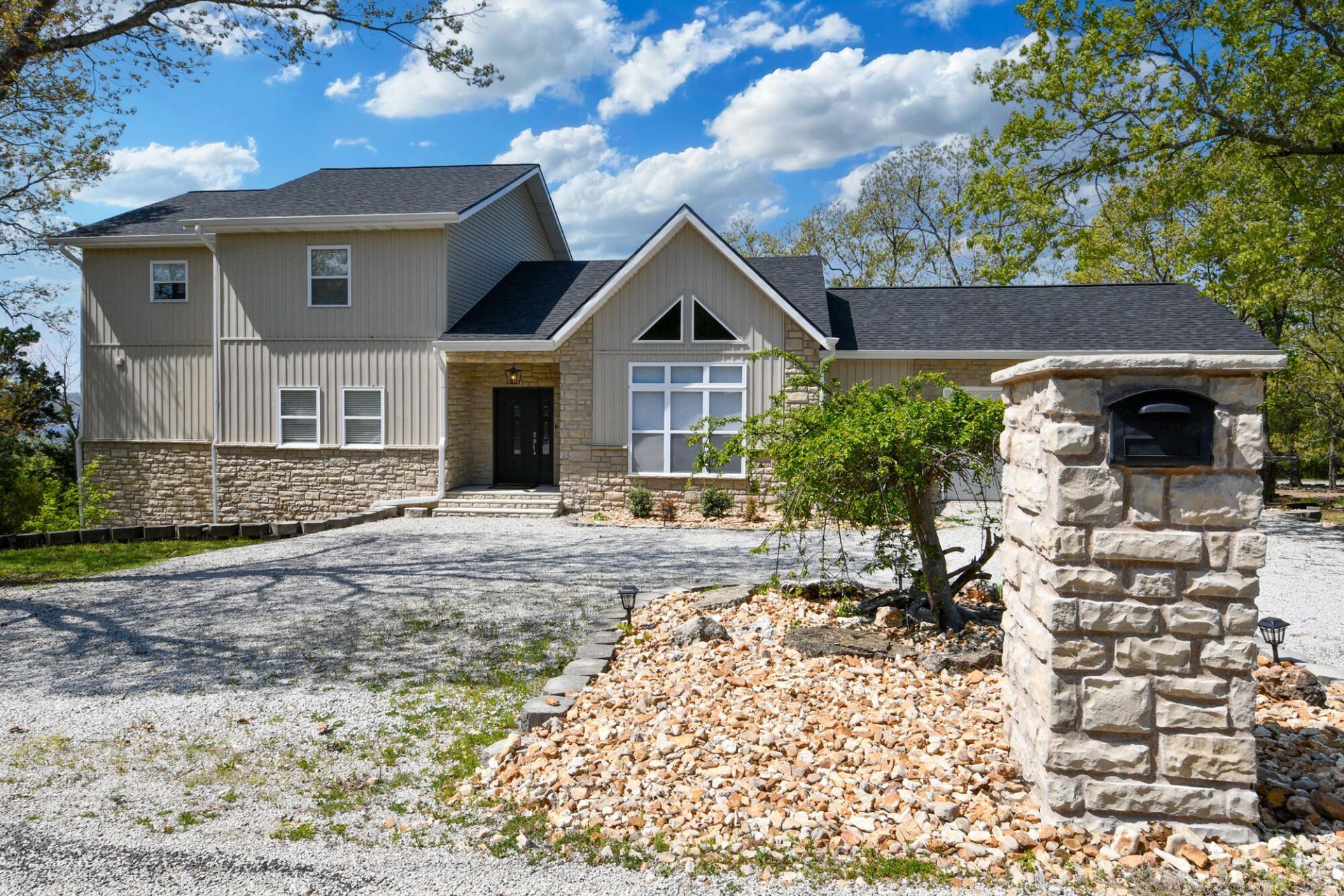 It's the Complete 'Lake' Package: Designer Chic Lake View Home, furnished and outfitted, plus a 2018 luxury TriToon in 10 x 28 slip at nearby State Park Marina! Light, airy open-concept great room has soaring ceilings, updated kitchen and seating for the whole tribe! New and Newer: Decks, A/C Unit, Well and Culligan water system, roof, blinds, fixtures and lake-y decor! Desirable neighborhood around the corner from the rustic luxury of Big Cedar for play, dining & day spa! Main level has Great Room with living, dining & kitchen, 2 bdrms, full bath + powder room & large laundry. All furnished. Upper level private en-suite bedroom with huge bath, 4th bdrm/office area AND private deck with stunning views! Back yard leads to trails below the house that wander to the water's edge! Clean 2018 low miles Veranda TriToon w/2017 Yamaha 175 4-stroke included...you can apply to take over the 10x28 slip lease at State Park Marina. RV parking OK. Must see crawl space. ;) Oakmont amenities include clubhouse, indoor pool & hot tub, workout equip, RV park, pavilion & play area, boat launch! Lake Life here we come!
