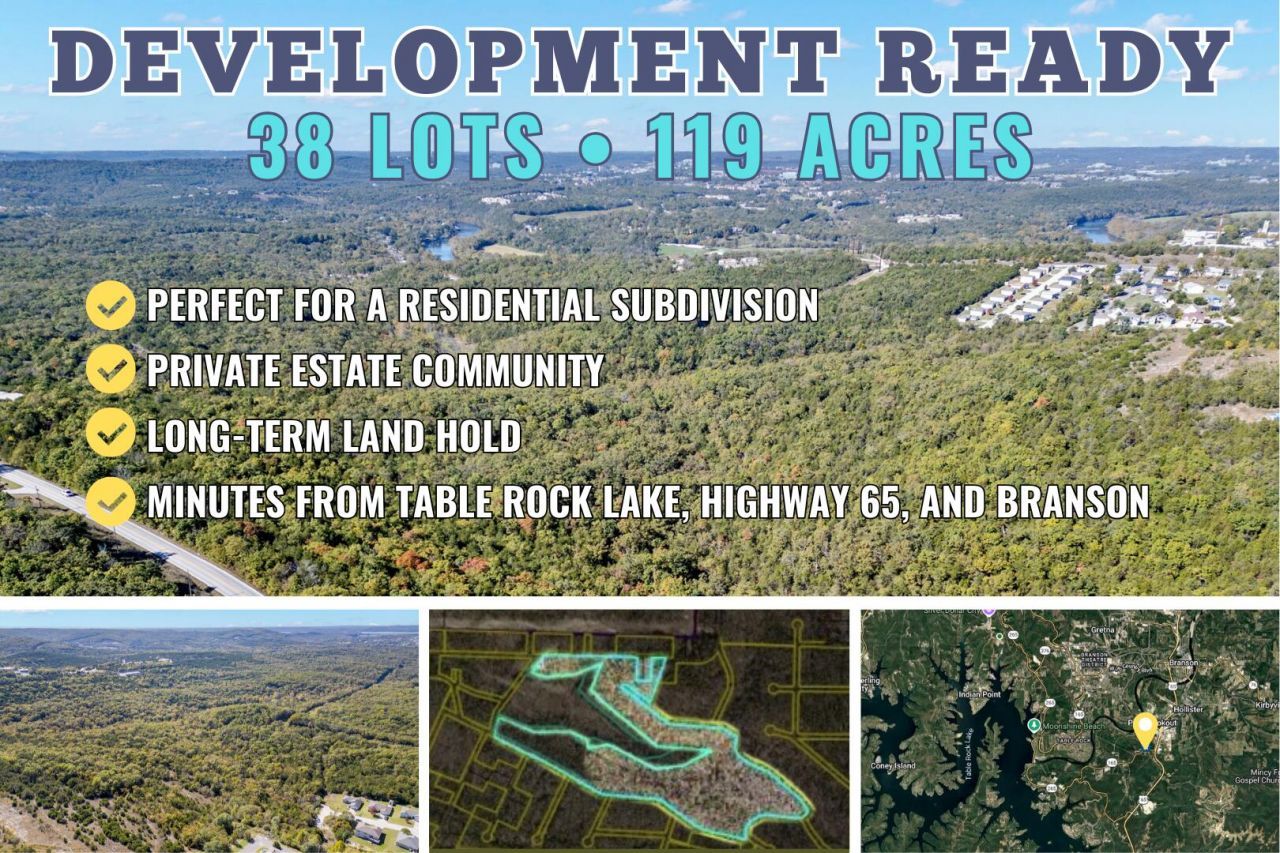 Discover endless potential with this rare offering of 38 individual lots totaling approximately 119 acres in the heart of Taney County, Missouri. Ideally located near Table Rock Lake, College of the Ozarks, and Highway 65, this property combines natural Ozarks beauty with convenient access to Hollister, Branson, and surrounding attractions. The land is mostly wooded, offering privacy, rolling terrain, and scenic vistas?perfect for a residential subdivision, private estate community, or long-term investment. Several parcels back up to an existing neighborhood, providing infrastructure advantages and flexible development options. Whether you're a developer seeking your next project or an investor looking to secure substantial acreage in a rapidly growing area, this property provides location, scale, and opportunity in one exceptional package. Convenient access to nearby roads enhances its appeal, and its proximity to Table Rock Lake and the Branson area adds long-term value. Don't miss this chance to shape the next great community in the Ozarks.
